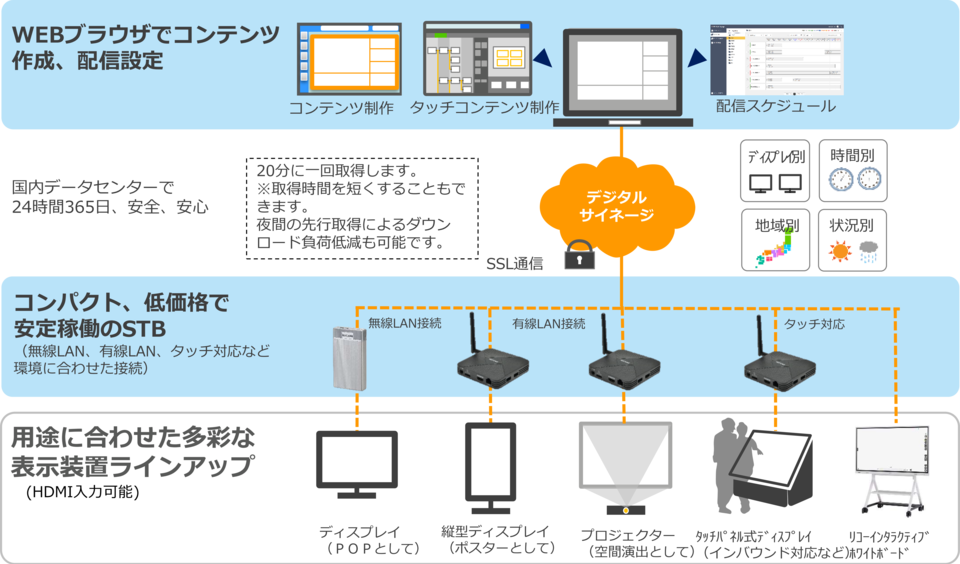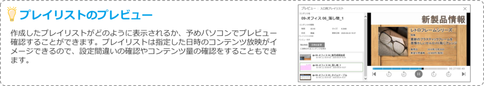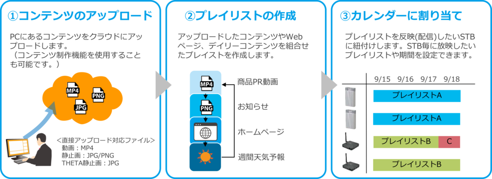 コンテンツのアップロードからSTBの再生まで、直感的に、かんたんに設定ができます。プレイリストを更新することで自動的に各STBが放映するコンテンツを差し替えることも可能です。(①→②の操作で完結)