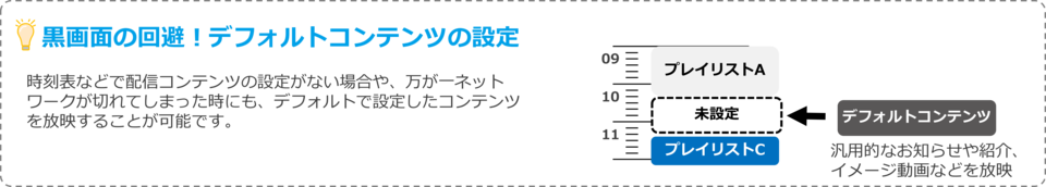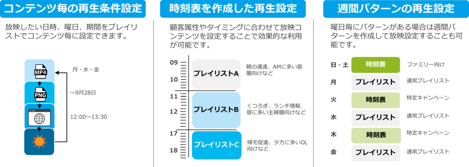 コンテンツ毎の放映する時間帯や曜日、期限の設定はもちろん、パターン化まで簡単に作成可能です。