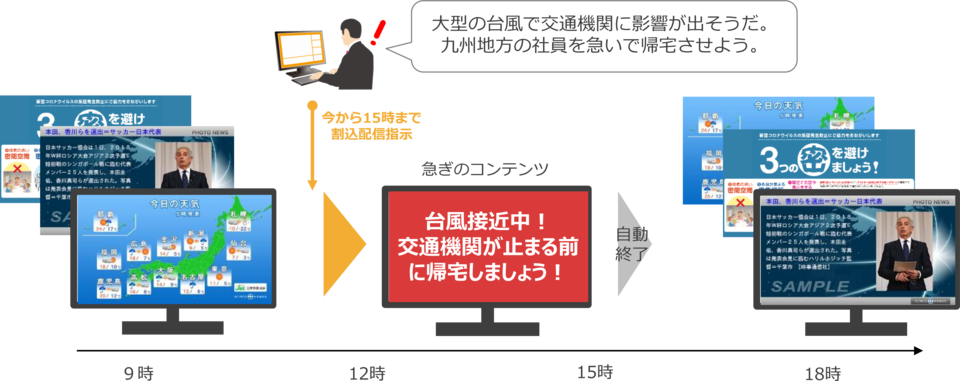 急ぎ放映したいコンテンツがある場合は割込み配信を行うことができます。割込み配信を行うと現在放映されているスケジュールに対して一時的に上書きされて放映されます。