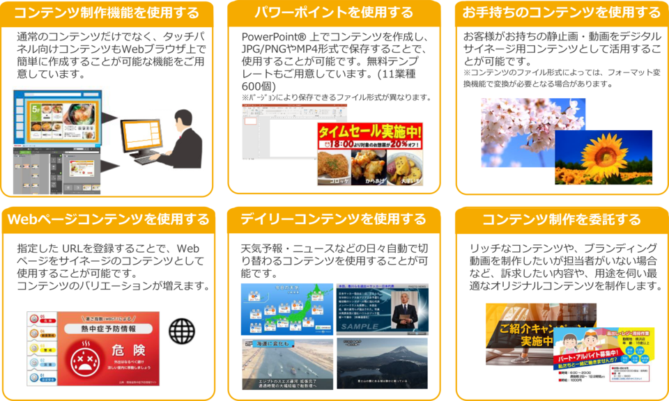無人接客システムのデジタルサイネージのコンテンツは以下の6つの方法で用意することができます。