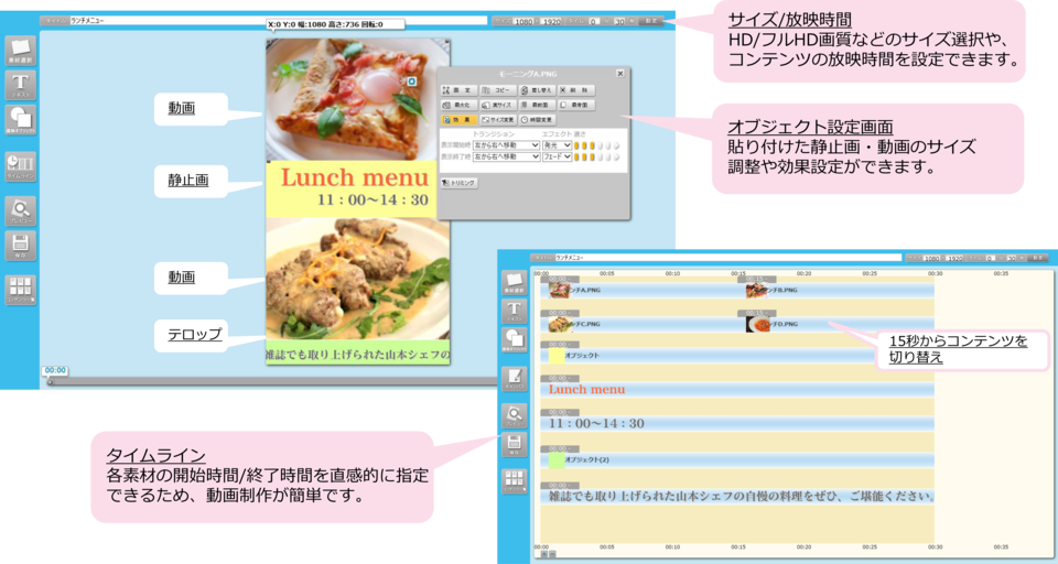 キャンバスへ素材やテキストを入れたり、効果(動き)を付け、放映時間を設定することができます。縦型コンテンツに横型素材を貼り付ける際など便利です。