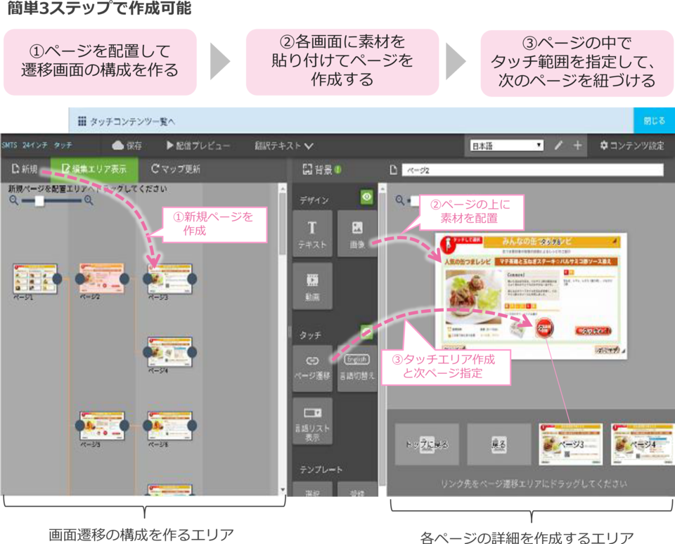 専門的な知識やソフトウェアが無くてもWebブラウザ上で、簡単にコンテンツが制作が可能です。