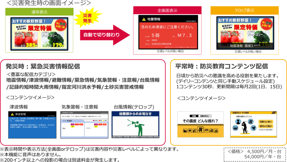 発災時にサイネージへ災害情報を自動配信し、社員やお客様へ適切な行動を促します。