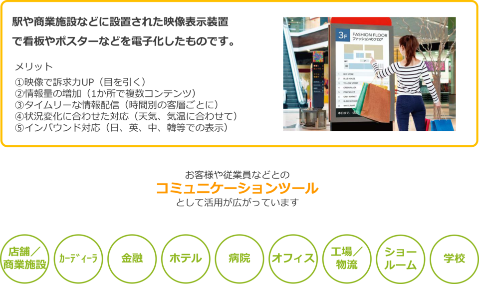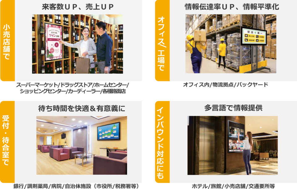 デジタルサイネージは多くの業種に活用が可能なソリューションです。