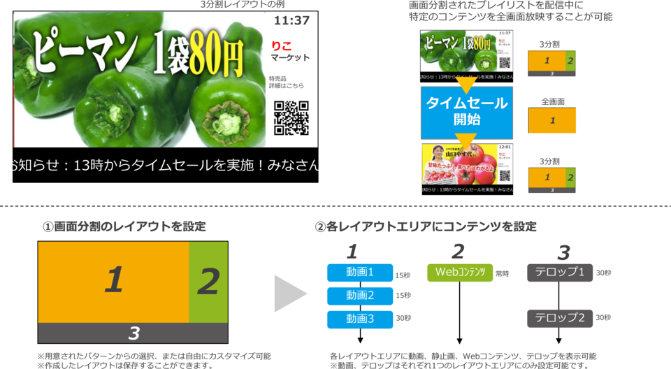 ディスプレイを複数エリアに分割して、それぞれコンテンツを配信することが可能です。