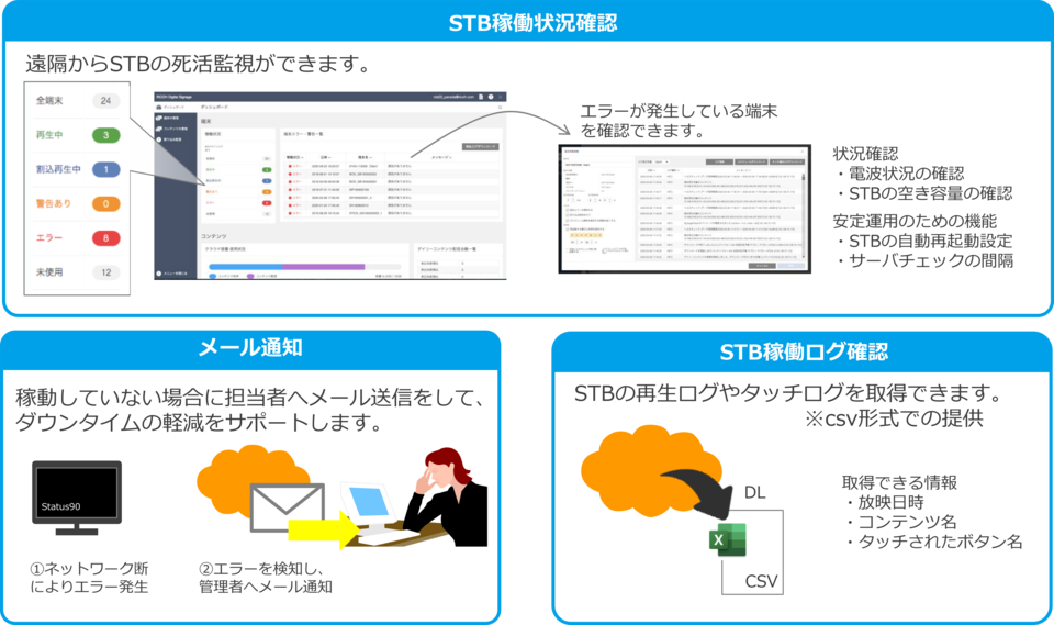 STBの稼働状況やログを管理画面から簡単に確認でき、管理者の負担を軽減します。
