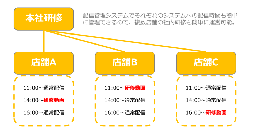 普段サイネージとして使っているモニターに、時間指定で研修動画を流すことも可能。店舗状況に応じて、配信時間を店舗ごとに変えたりすることも可能。複数店舗での社内研修の運営も、わざわざ移動することなくスムーズに行えます。
