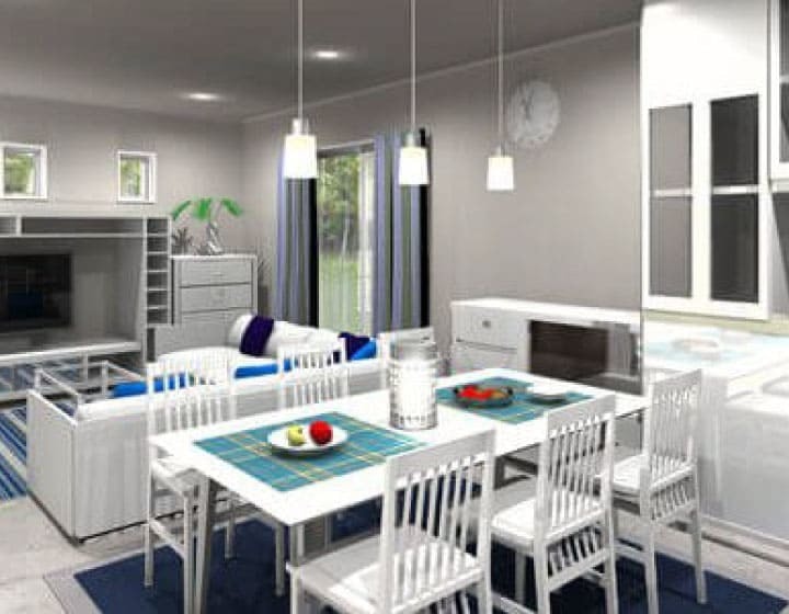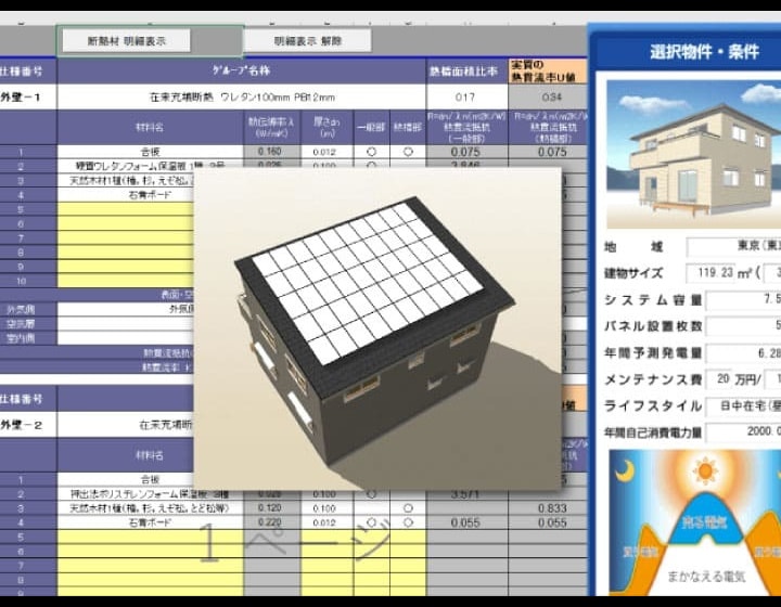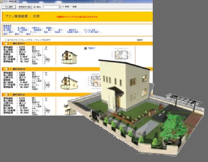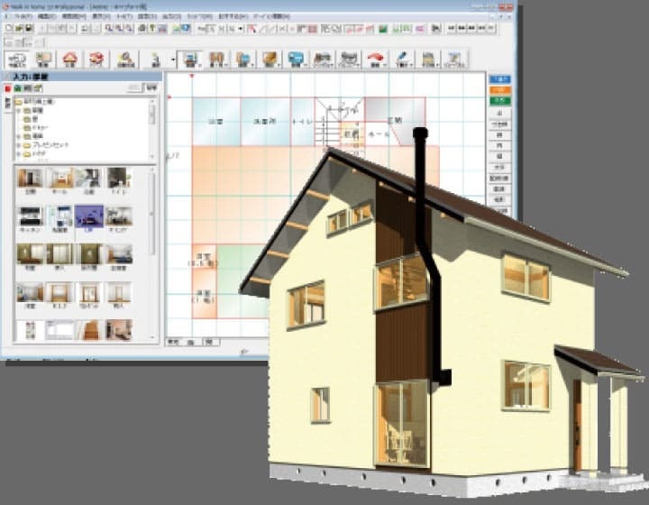 屋根形状、内装建材(建具、フローリング・クロスなど)、外装建材(外壁・タイルなど)、住宅設備(キッチン・トイレなど)の変更も簡単にできます。パースを見ながら変更が可能ですので、お客様が相談しながら建物の具体的なイメージを表現することができます。