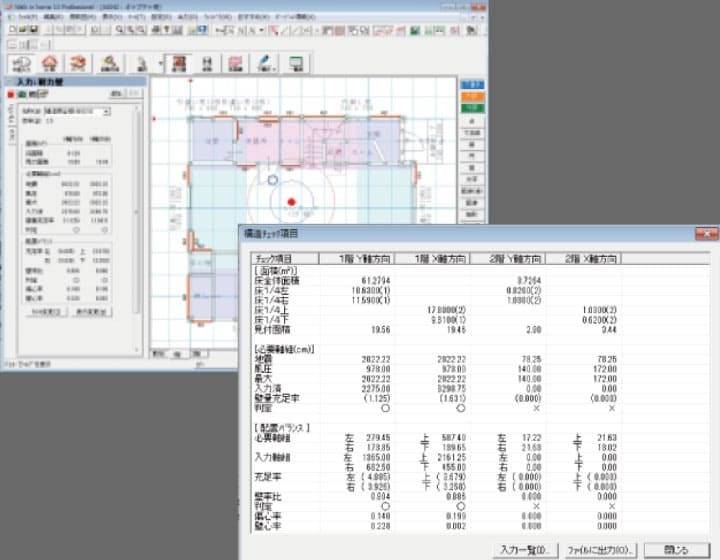 Walk in home(ウォークインホーム)は、建築CADなので、耐力壁計算(筋交い計算)も行えます。プレゼンだけではなく実際にプランが建つのかのチェックもできます。