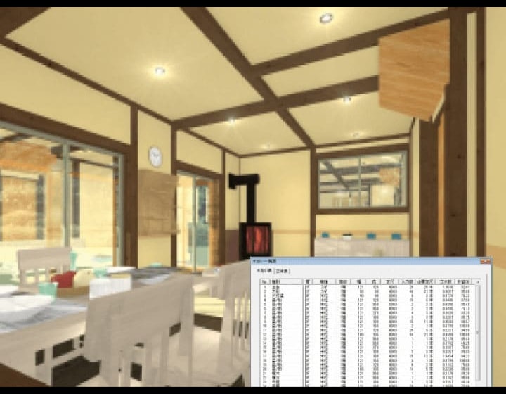 Walk in homeは構造伏せ図にも対応しており、基礎伏せ図・土台伏せ図・1F床伏図・2F床伏図・1F梁伏せ図・2F梁伏せ図・小屋伏せ図などを作成できます。構造CADの機能スパン表も持っており、自動生成で一括して作成することが可能です。また継ぎ手や仕口などの情報も持ち建築CADでありながら、構造CAD並みの情報も持っています。伏せ図から木拾い帳票も出力でき、意匠と構造を融合させることでリアルなパースが表現できます。